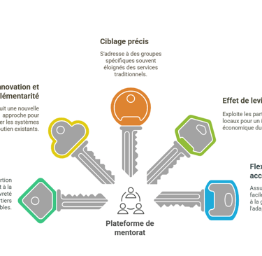 Des interactions régulières entre mentors et bénéficiaires. Mise en commun d'outils et de ressources clés. Réseautage, partage de bonnes pratiques et de retours d'expérience entre mentors et entrepreneurs de mêmes niches.